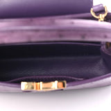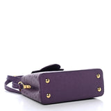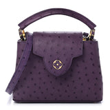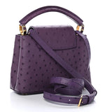 Pre-Loved LOUIS VUITTON Ostrich Capucines BB Amethyst. This beautiful bag is composed of luxurious ostrich leather in purple. The handbag features a single rolled leather reinforced top handle, stylized links, and a crossover flap that inserts behind the prominent LV. The interior is a purple leather creating a luxury style for day or evening from Louis Vuitton.