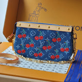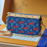 A rare fusion of iconic craftsmanship and contemporary art, the pre-loved Louis Vuitton x Takashi Murakami ‘Cherry’ Denim Pochette is a collector’s dream and a statement of playful sophistication. Born from the celebrated collaboration between Louis Vuitton and renowned Japanese artist Takashi Murakami, this limited-edition piece captures the joyful essence of Murakami’s signature cherry motif against the classic monogram denim canvas.