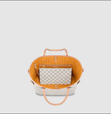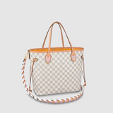 The Neverfull MM is made from Damier Azur canvas with a shoulder strap in two-color braided leather and colorful braided handle mounts. The leatherwork is braided entirely by hand. The bag's side laces can be cinched to change its silhouette. A removable pouch inside can be used as a clutch or an extra pocket.