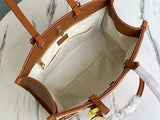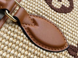 This limited edition tote is composed of sustainably sourced viscose and recycled cotton, woven into a raffia textile and printed with an oversized Louis Vuitton monogram print in brown against a natural beige. Grained calfskin trim is found at the side gussets and base, and the two rounded top handles are accompanied by two longer shoulders straps, made of smooth calfskin. The top is open to a yellow striped fabric lining with a single zip pocket and two flat pockets.