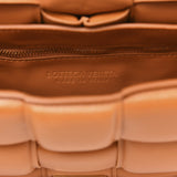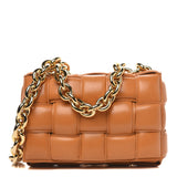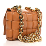 We guarantee this is an authentic BOTTEGA VENETA Lambskin Maxi Intrecciato Padded Chain Cassette Crossbody Bag Clay or 100% of your money back. This stylish shoulder bag is crafted of soft padded and woven calfskin leather in clay. The bag features a gold chain shoulder strap and a shorter chain handle. It opens to a matching leather interior with a zipper pocket.