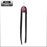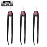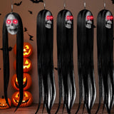 Create the ultimate spooky atmosphere with the Halloween Hanging Ghost Skull Decoration — a terrifyingly realistic skull with long black hair and glowing red LED eyes.
