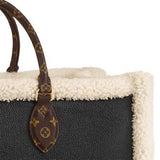 The OnTheGo GM tote is fashioned from grained black leather with shearling inserts that create Monogram Flowers and LV Initials.
