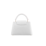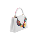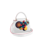Beatriz Milhazes’ limited edition ARTYCAPUCINES enhances the Capucines MM in white lambskin through remarkable marquetry work, both on the body of the bag with 18 differently textured and colored leathers enriched by precious touches of gold leaf, and on the LV signature with the unique combination of enamel and gel.
