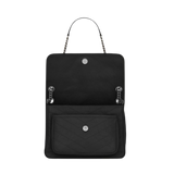 SAINT LAURENT MONOGRAM BAG WITH FRONT FLAP, LEATHER-ENCASED YSL MONOGRAM, CHAIN AND LEATHER CONVERTIBLE SHOULDER STRAP, CENTRAL COMPARTMENT, AND OPEN BACK POCKET.